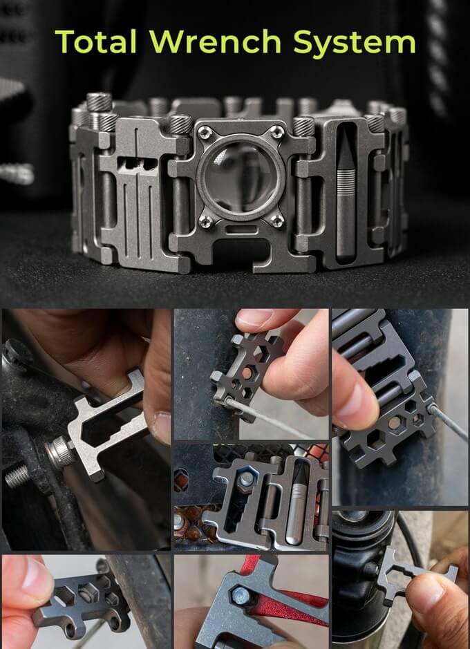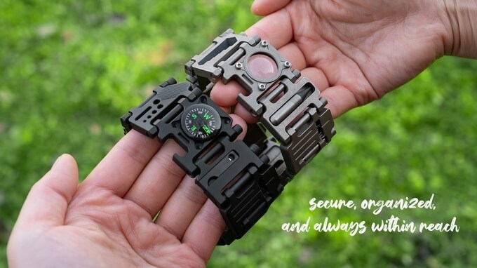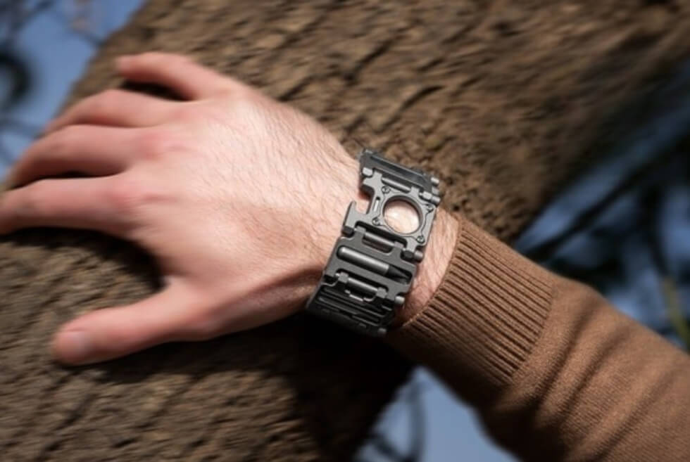 Wood Designs’ TiLink multi-tool stands out with its unique design. It masquerades as a stylish bracelet for effortless everyday carry. Yet, it packs most of the utility tools you’d need while outdoors. It’s essentially a modular tool system that lives on your wrist.
