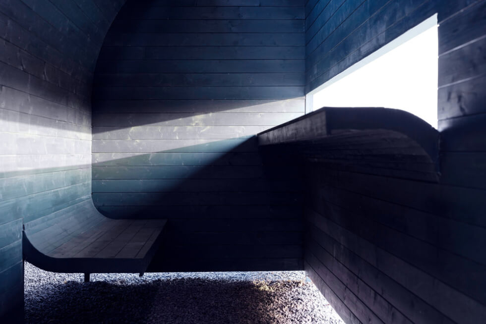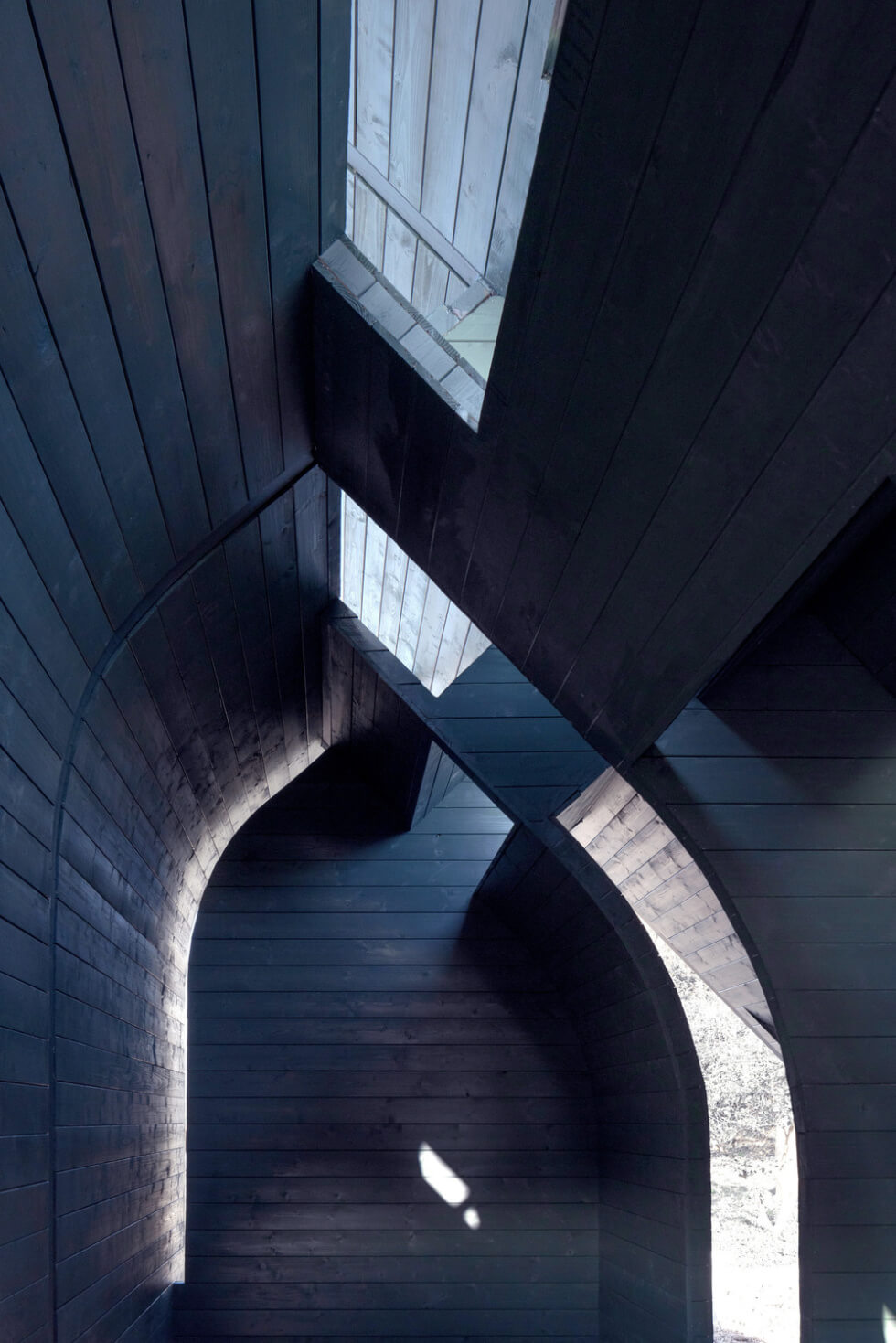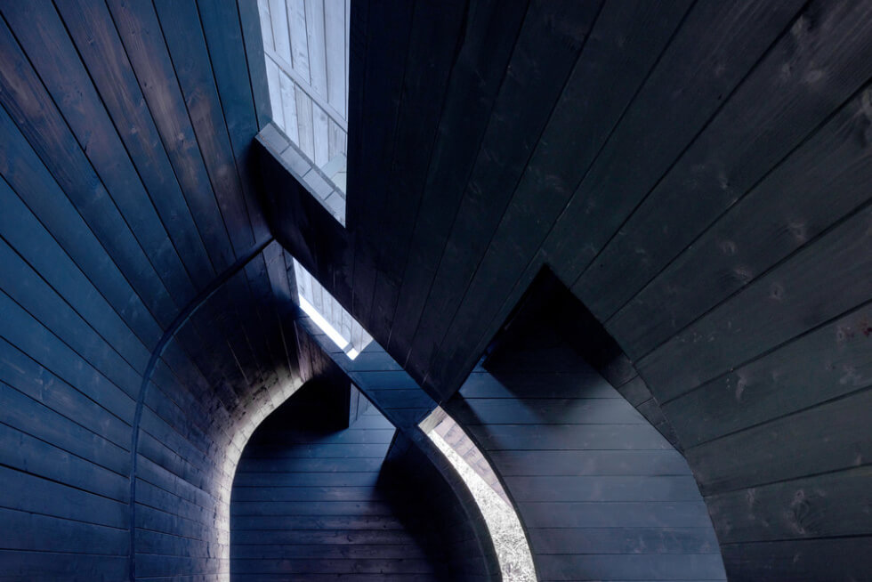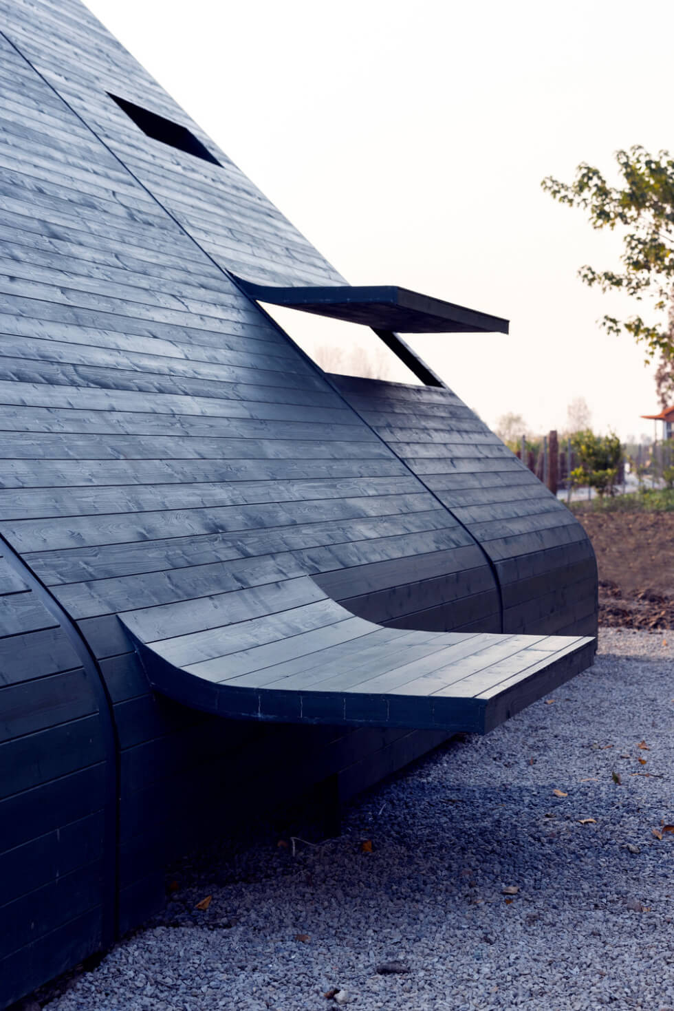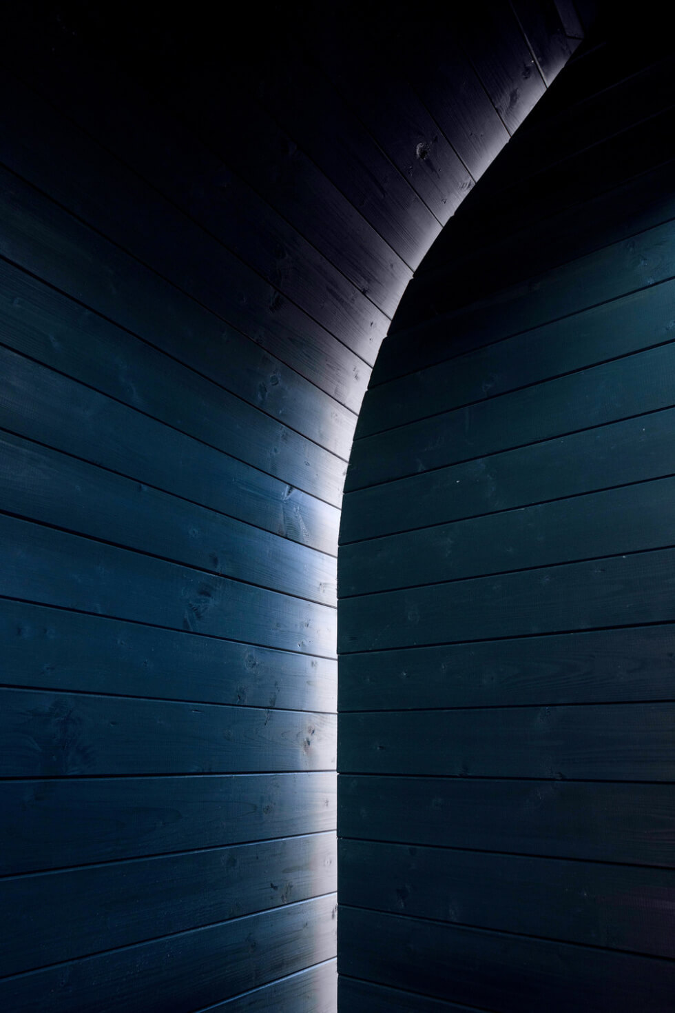 It may look like an enclosed design, but up close, there are cutouts and edges that do not completely meet. As such, being inside its volume creates a surreal atmosphere as slivers of light flow through the cracks. The dark tone of the wooden surfaces absorbs most of it and thus generates a muted glow instead.