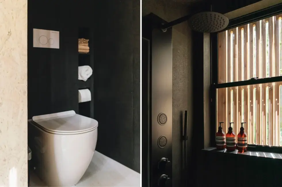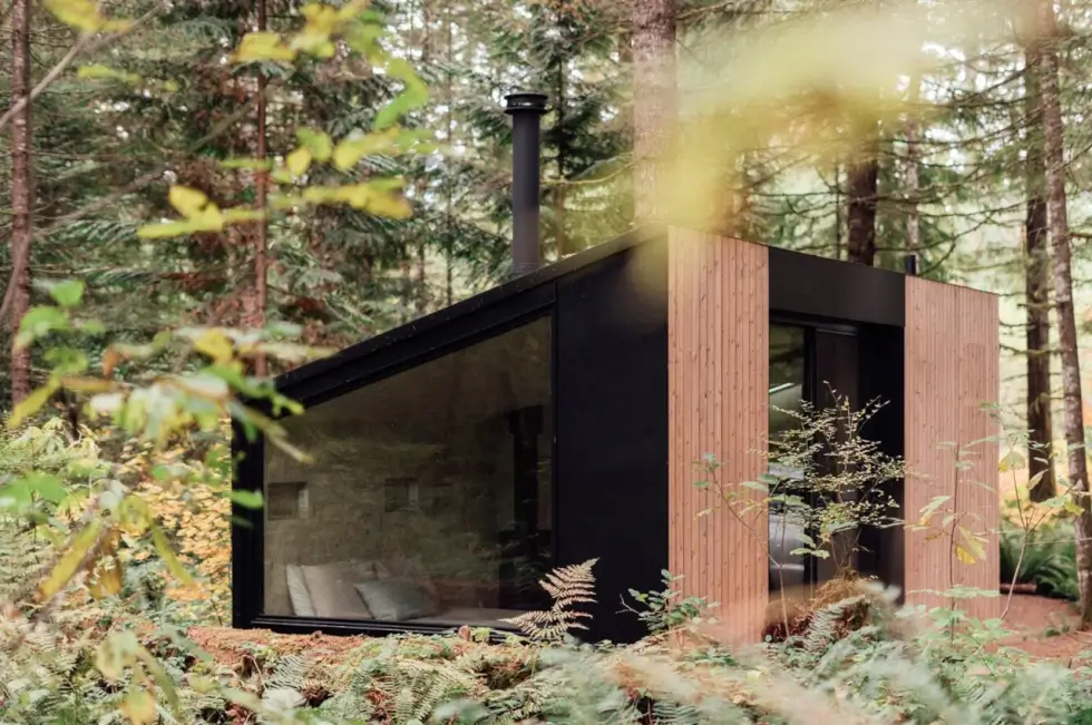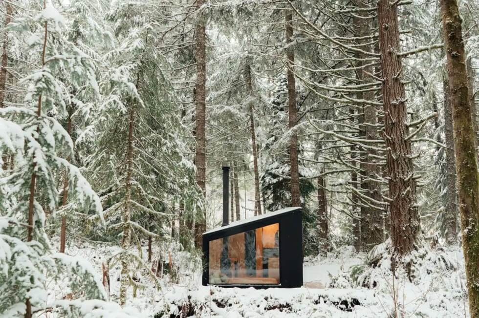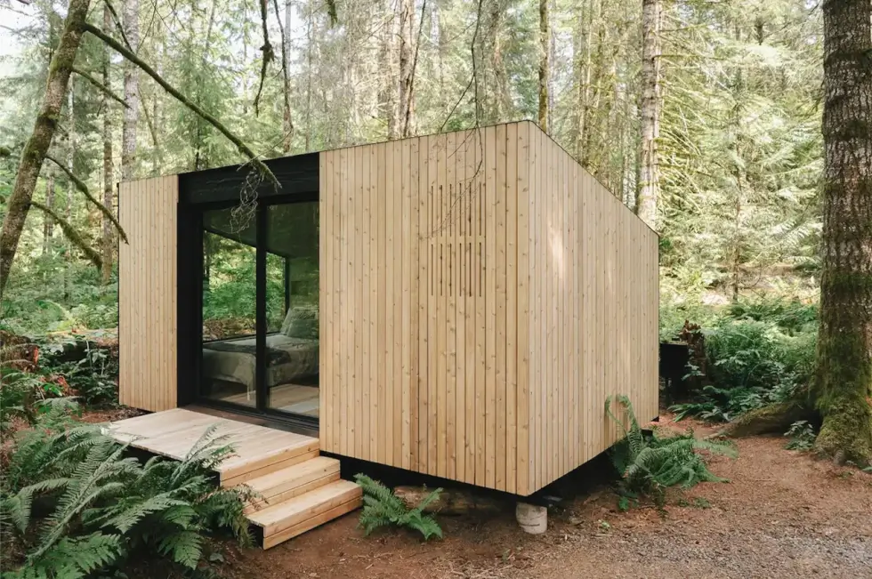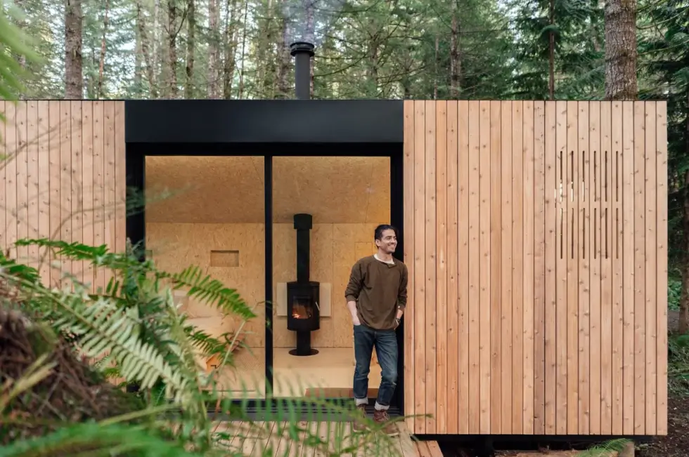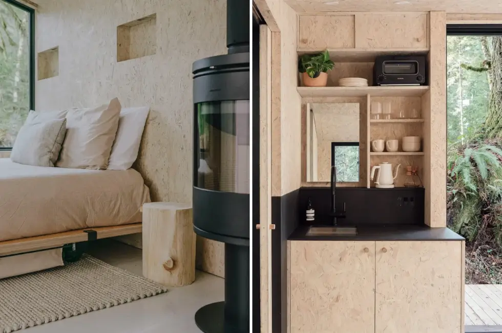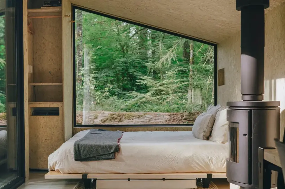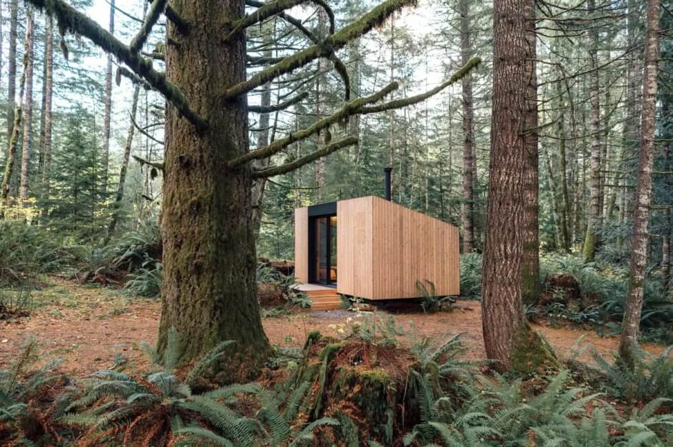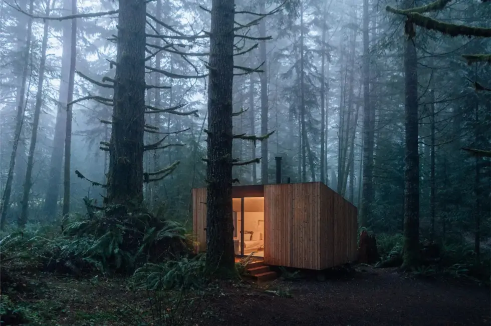 This small, nature-inspired cabin rests among giant pine trees in Sandy, Oregon. It is a 190-square-foot hut nestled in a cozy private neck of the woods some 200-feet away from architect Rico Castillero’s main property called the Woodlands. It’s a solo retreat home with modern comforts including Wifi, a portable air conditioner, a mini-refrigerator, and a kitchenette. It also has a toilet and bath and a woodfire stove that separates the private space from the common areas.