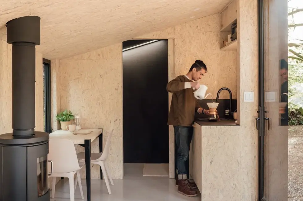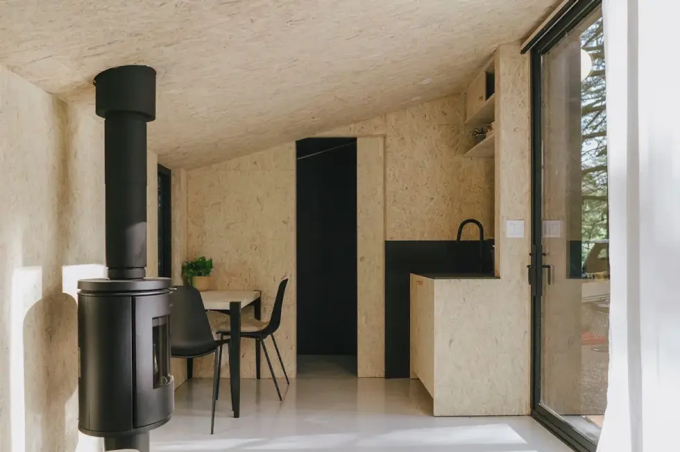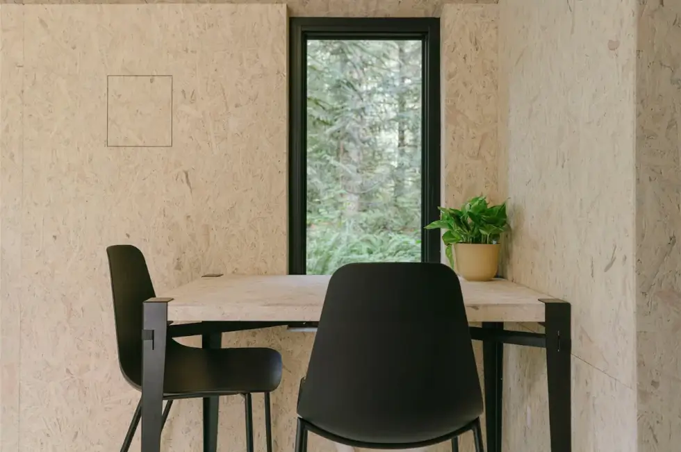 The Woodlands Hideout features a unique shape and a 10’ x 10’ x 20’ custom-built steel frame. Castillero then used oriented strand board (OSB) paneling for the interior. It is truly a cozy retreat even at first glance.