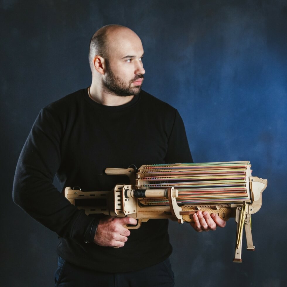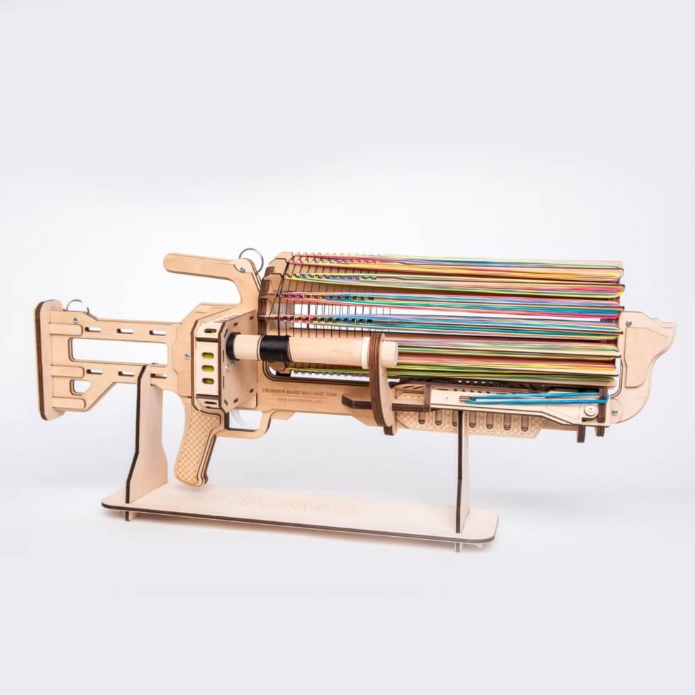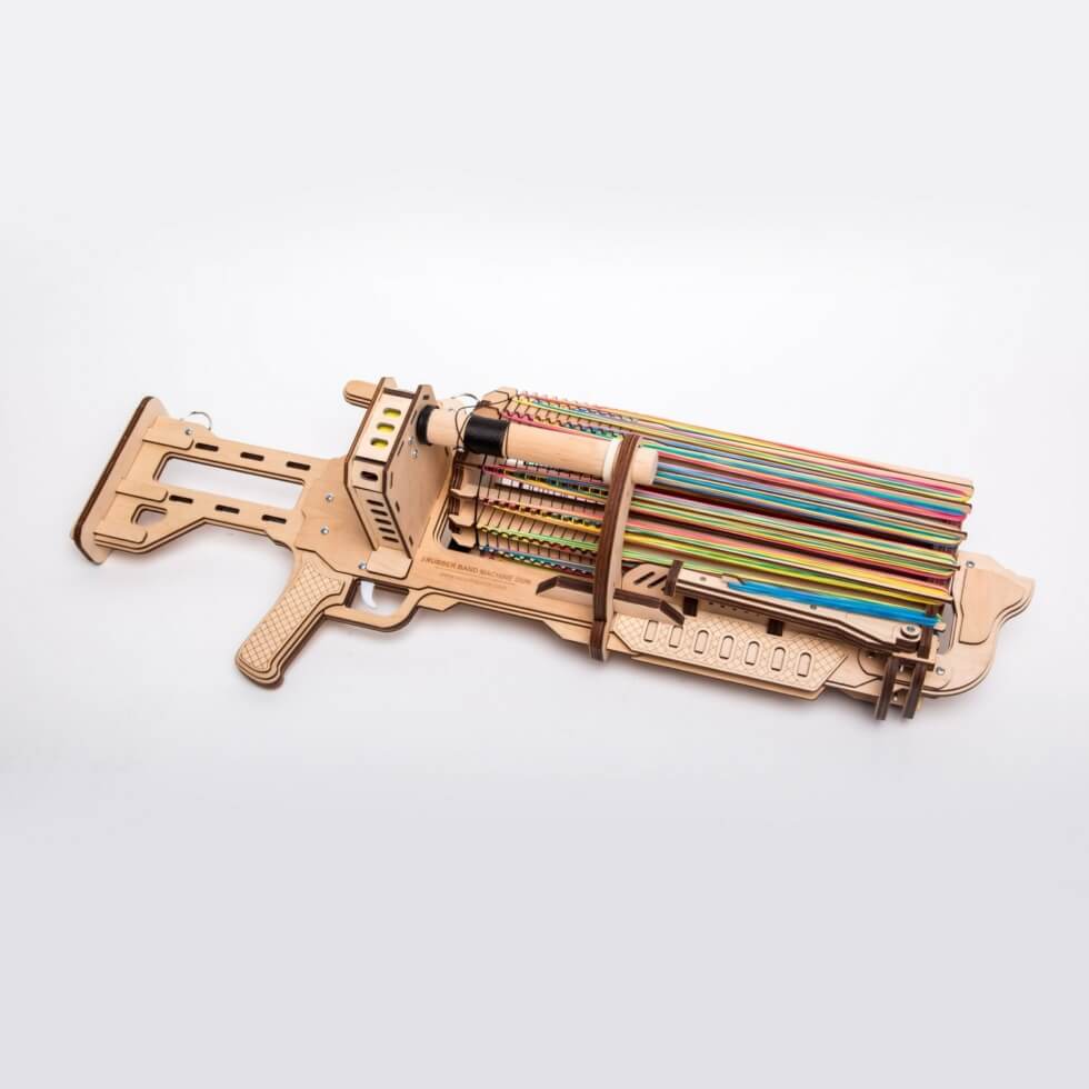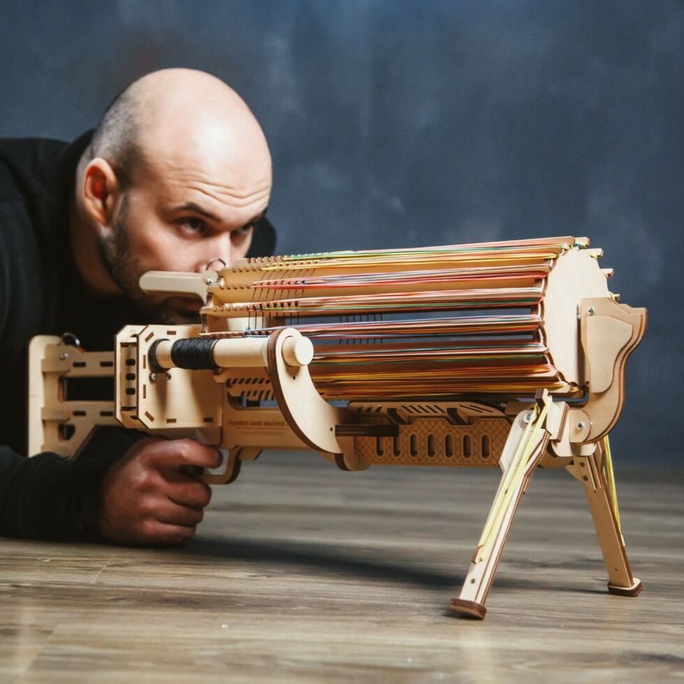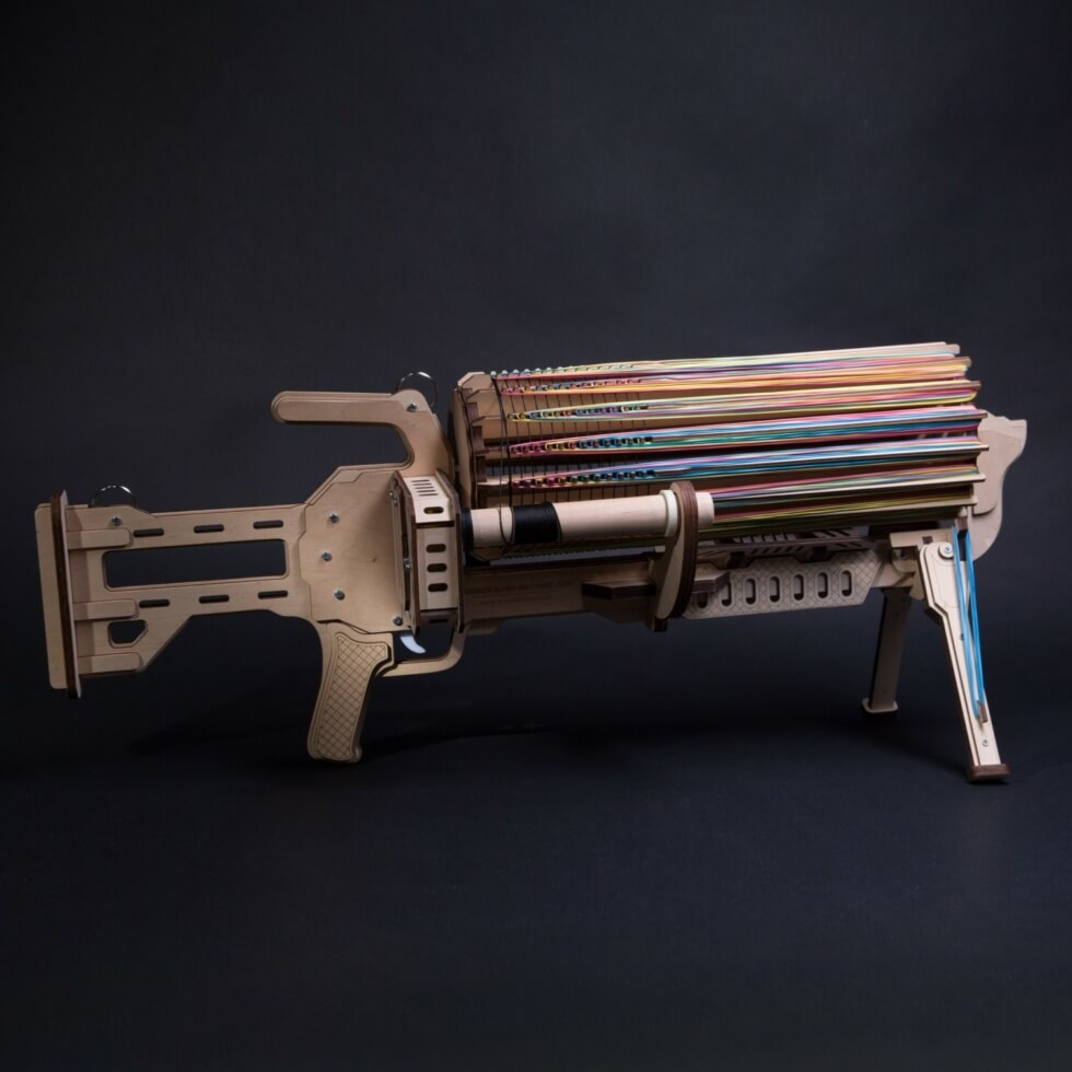 Anyway, we’ll gladly splurge for boxes of ammo from our local office supplies provider than go bankrupt from proprietary foam ammunition. The Rubber Band Machine Gun by WoodNBoom delivers premium craftsmanship as almost all parts have been machine cut with precision out of birch wood.