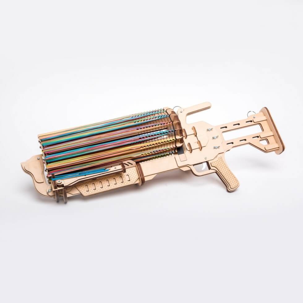 Just be careful and sand down some rough areas to keep splinters at bay. This wooden contraption packs an electric motor powered by five AA batteries. Just like a Gatling gun, the 16 barrels (in this case – stationary latches) fire up to 14 shots a second up to 26 feet.