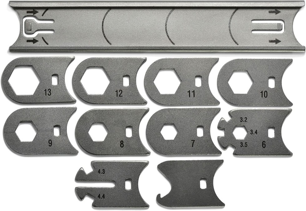 There are ten wrenches to choose from including 3.2 / 3.4 / 3.5 mm spoke wrenches. Other Box-End Wrench sizes include 7 / 8 / 9 / 10 / 11 / 12 / 13 mm. Then there are also Wing Nut Wrenches (built-in Shimano 4.3 / 4.4 mm spoke wrenches). It even comes with a bottle opener. The “Pop-A-Point” mechanism employed by the WRENCHit could even work as a fidget toy for some.