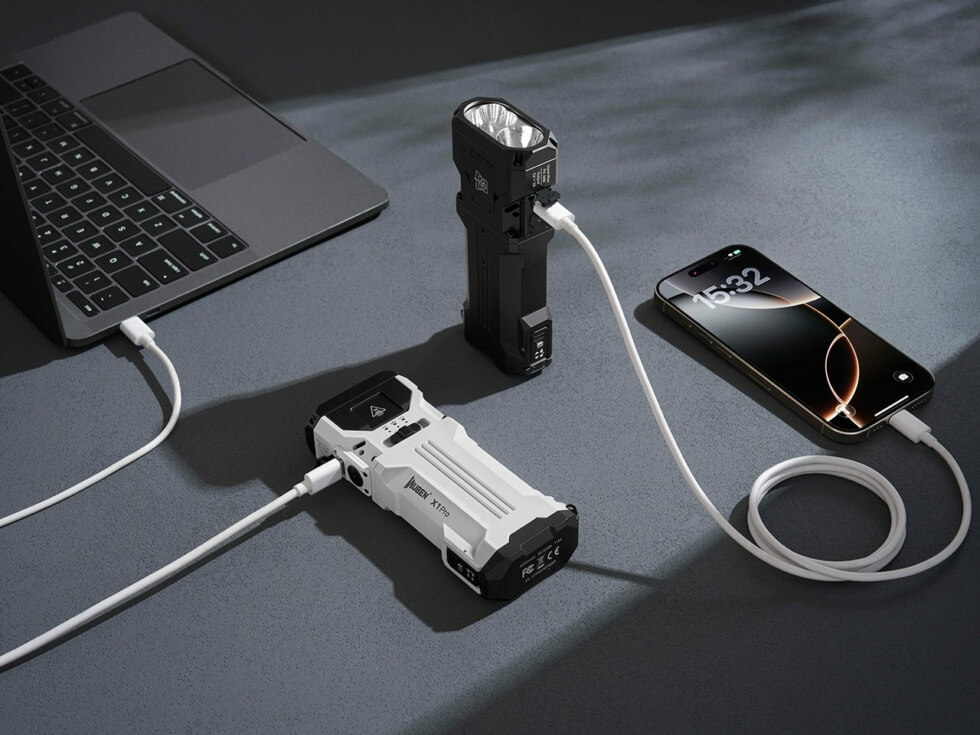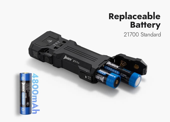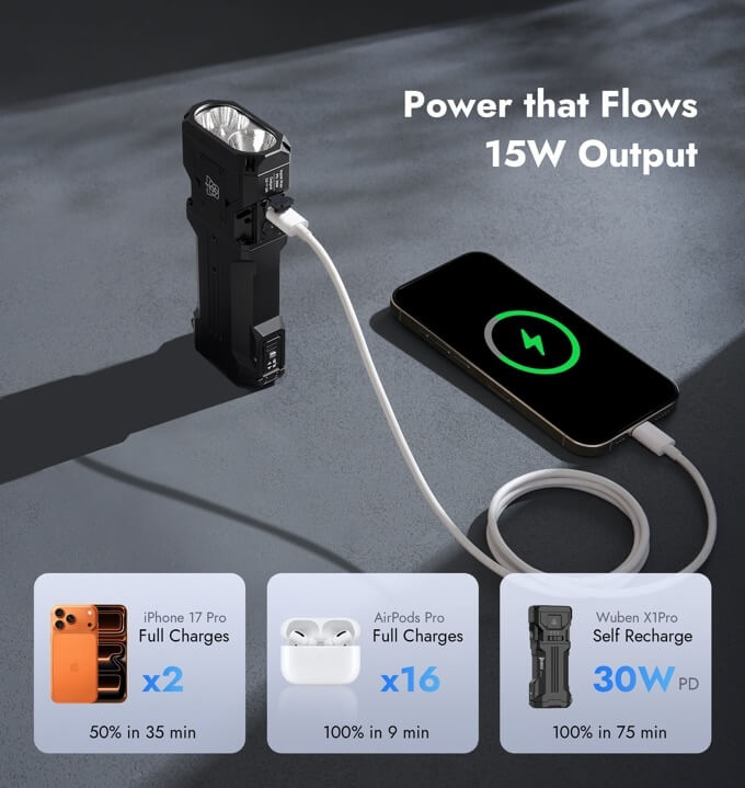 The WUBEN X1Pro runs on removable 21700 rechargeable batteries that go from 0 to 100% in 75 minutes. The 4800mAh batteries double as a power reserve, able to output 15W to charge other mobile devices like phones, earbuds, cameras, and more.