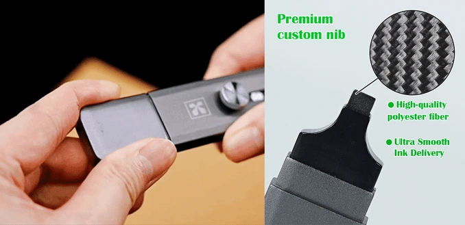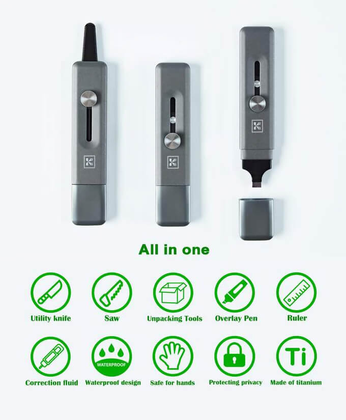 The pen uses a special nanomaterial ink that offers superior molecular penetration for exceptional coverage. Then on the side of the cutter is a ruler scale for measuring or drawing lines. The X-Cutter is built light yet tough to handle everyday use. It’s crafted from titanium and comes with a titanium pocket clip for portability.