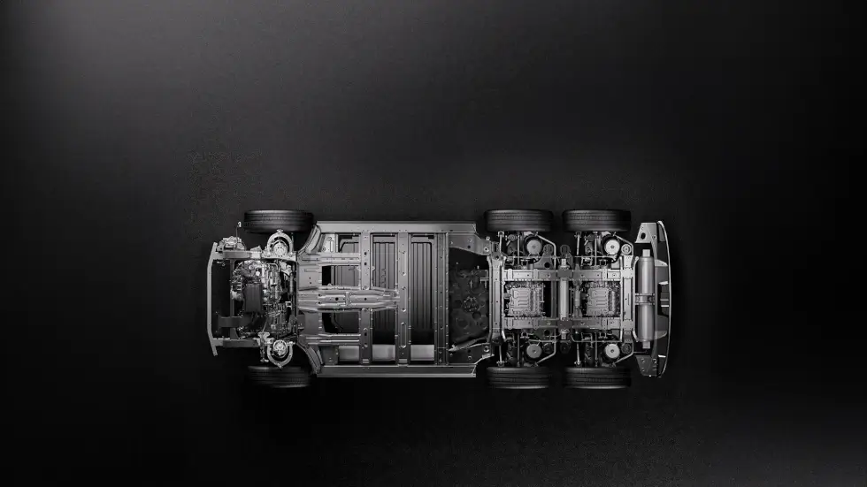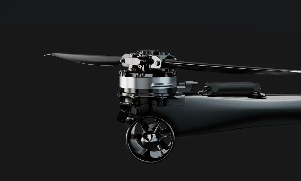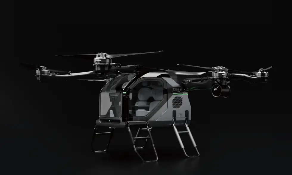 It features foldable rear-view mirrors, electric dual-swing doors, a six-wheel-drive system, rear-wheel steering, and a robust suspension system. Meanwhile, the aircraft boasts foldable arms, foldable blades, and a dual-duct design.
