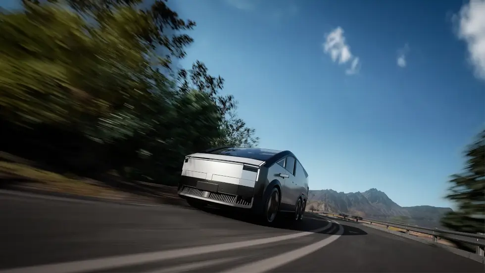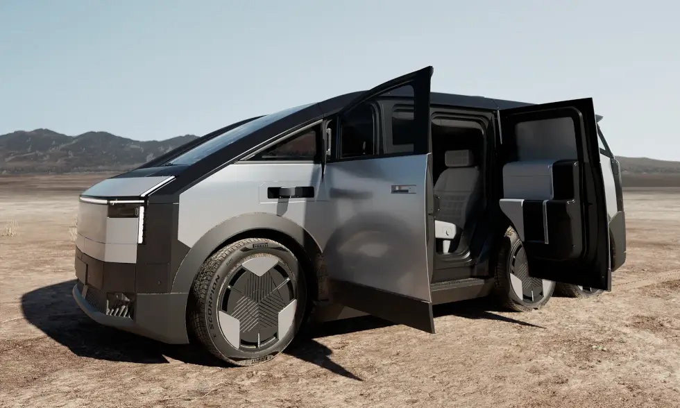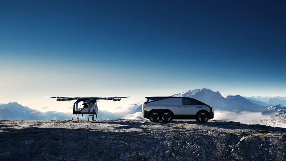 For travel on land, there is the four-seat electric van, which also oddly resembles Tesla’s Cybetruck but touts an extra axle. The EV needs it because the rear compartment doubles as the storage for the companion two-seat six-rotor flyer. As you can see, this provides versatile coverage for two types of traversal.