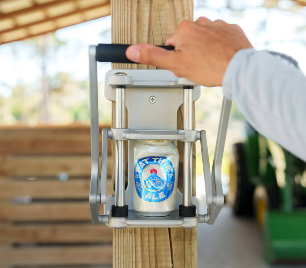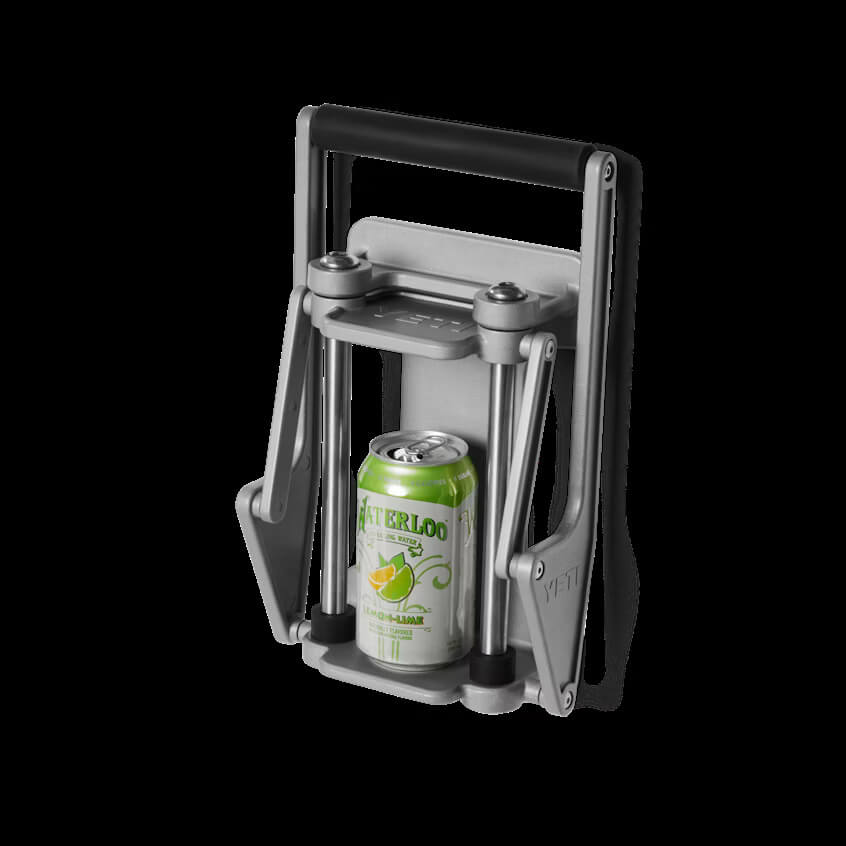 The YETI Can Crusher is a solid 2.40 kg. of metal mutilator that can effortlessly handle 12-ounce standard, 12-ounce slim, and 16-ounce tallboy cans and compress them down into the size of a hockey puck. It comes with screws for mounting, ideally to a solid surface like a wooden pole or a stud and not on flimsy areas like drywall.