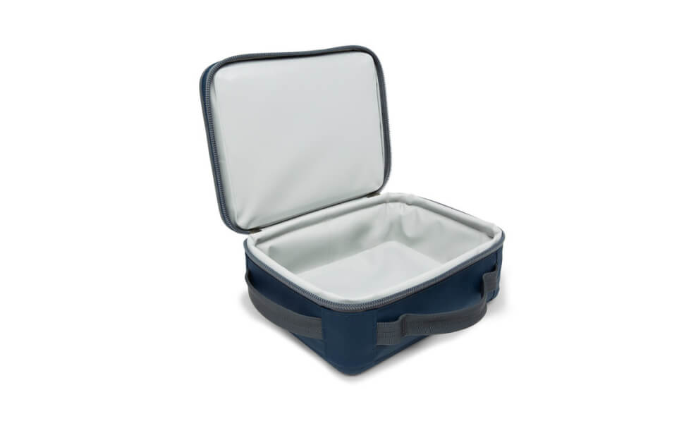 The Yeti Daytrip Lunch Box comes weighs 1.1 lbs. and provides enough room for a sandwich, fruit, juice, and more with its storage space that measures 9 3/4″ × 7 3/4″ × 2 1/2″. It comes in the colors navy, charcoal, and coral.