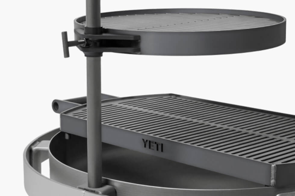 YETI’s Fire Pit transforms into a proper live-fire cooking station using the brand’s Grill Kit (sold separately). It has a large rectangular grate for grilling and a smaller grate mounted on an adjustable post that swivels and moves up and down.