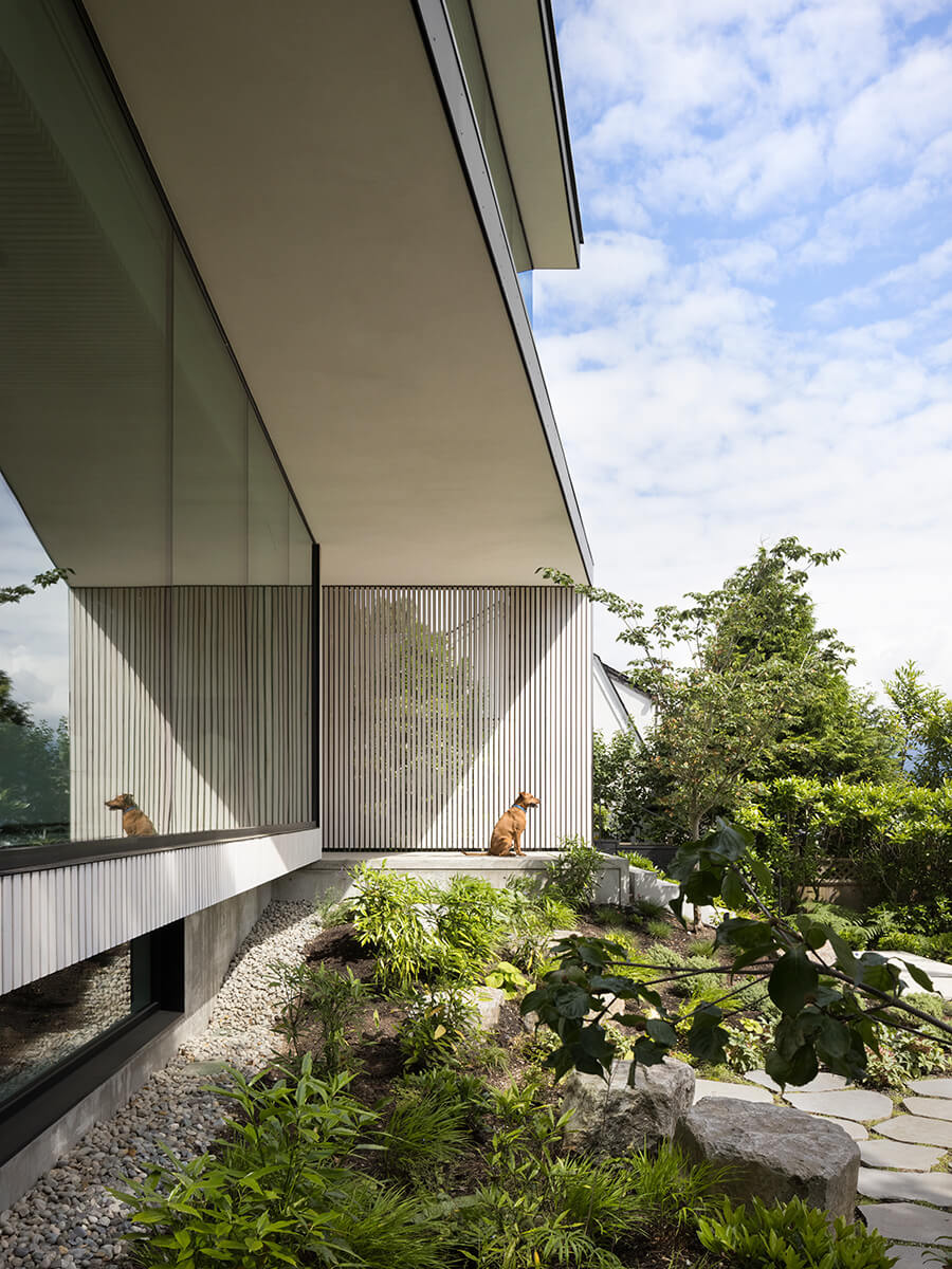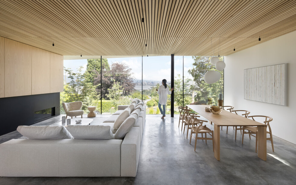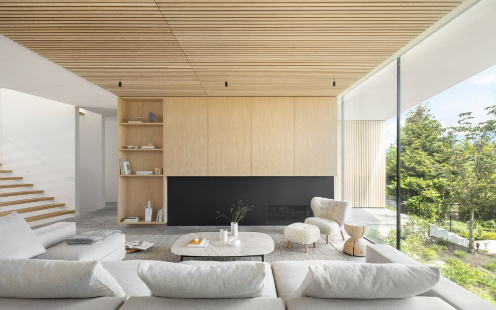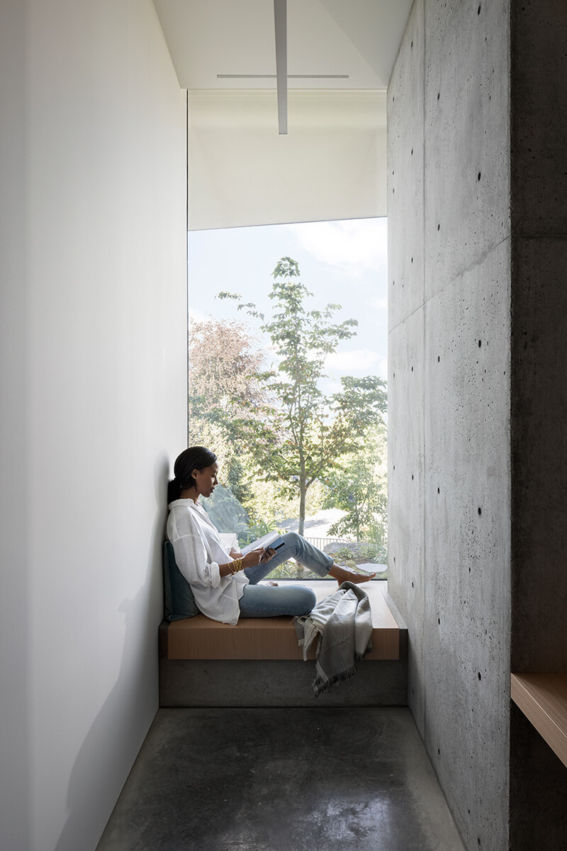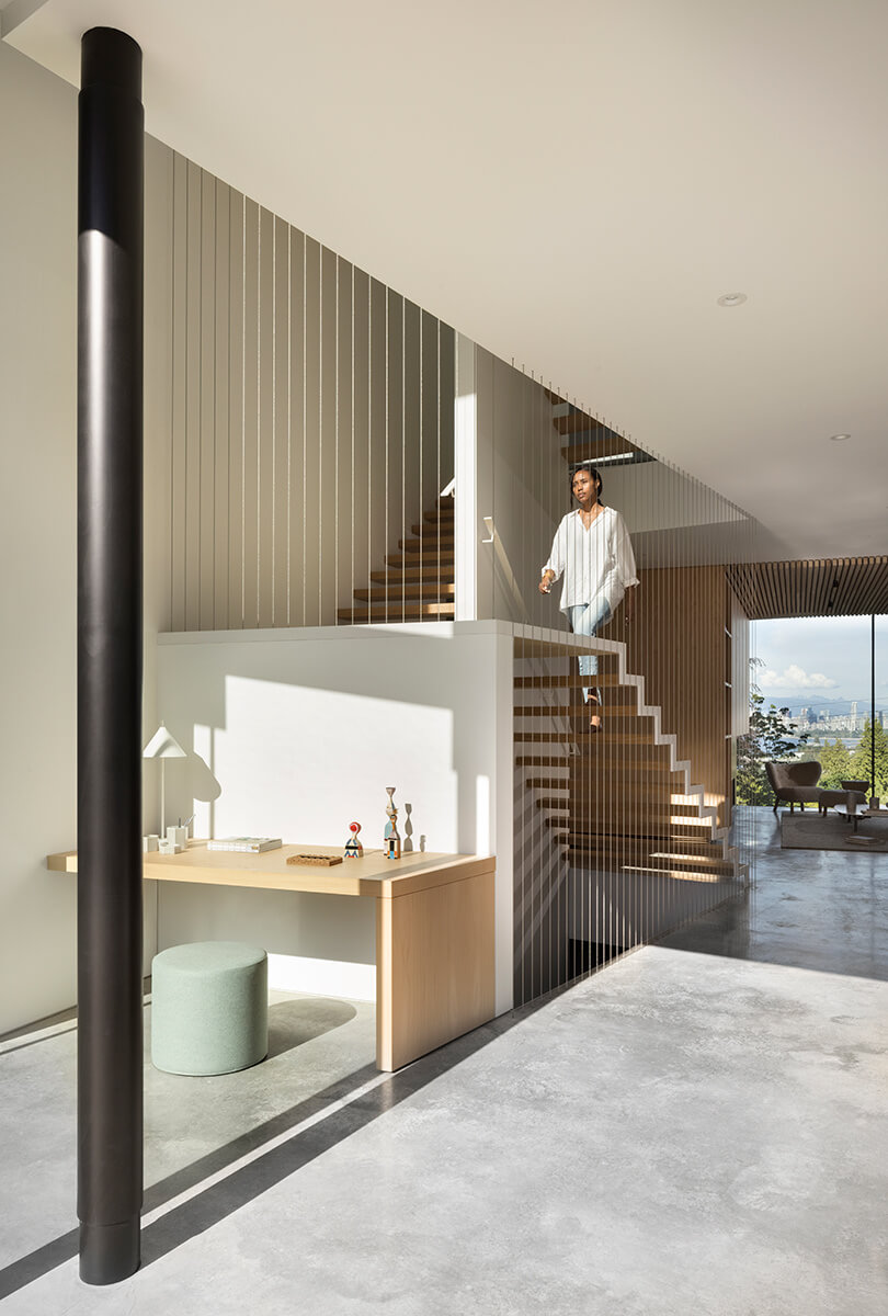 Meanwhile, the rear part of the house, on the west, has tall windows that frame views of Douglas firs and western red cedars of Vancouver’s coastal rainforests. The Yield House is strategically designed for maximum views of its surroundings. It sits 17 feet above the street’s sightlines. A concrete wall and a cantilevered stair from the road to the main entrance set it apart from the pedestrian sequence.