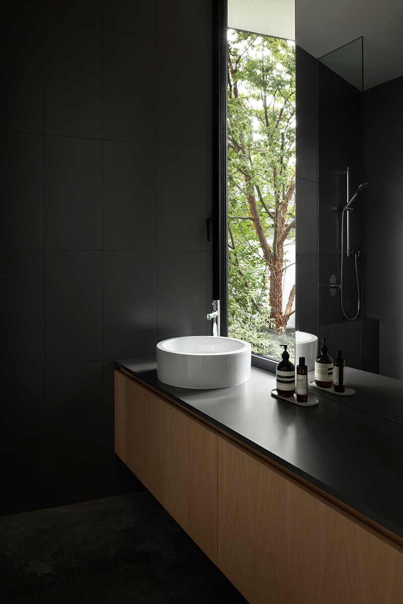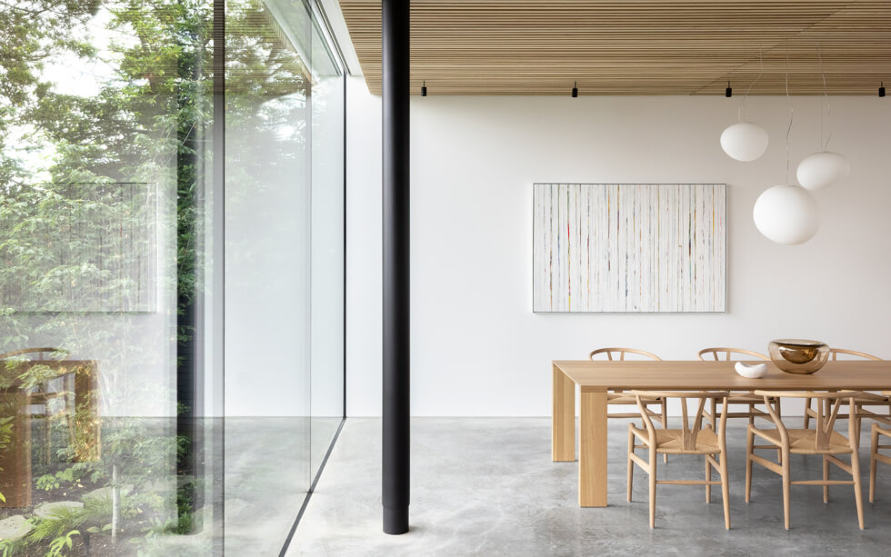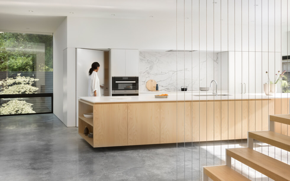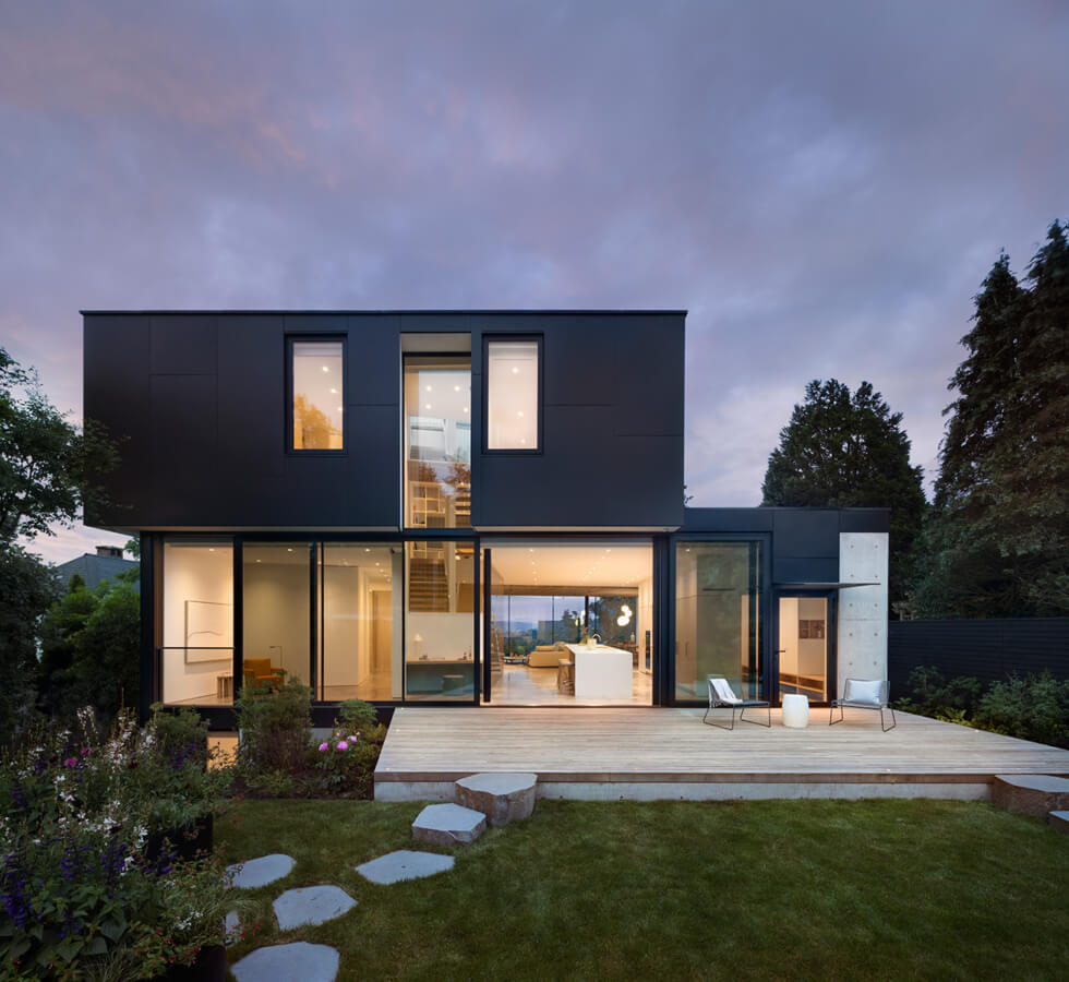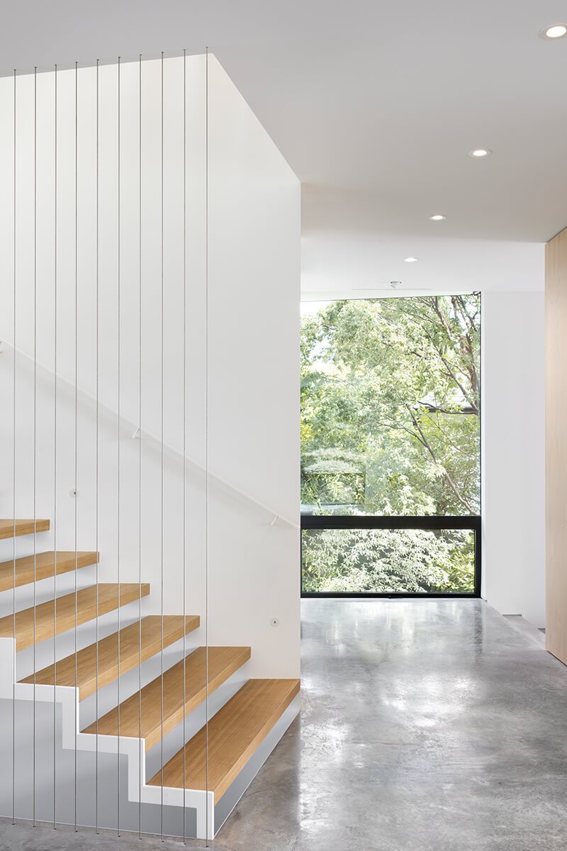 Meanwhile, the rear part of the house, on the west, has tall windows that frame views of Douglas firs and western red cedars of Vancouver’s coastal rainforests. The Yield House is strategically designed for maximum views of its surroundings. It sits 17 feet above the street’s sightlines. A concrete wall and a cantilevered stair from the road to the main entrance set it apart from the pedestrian sequence.