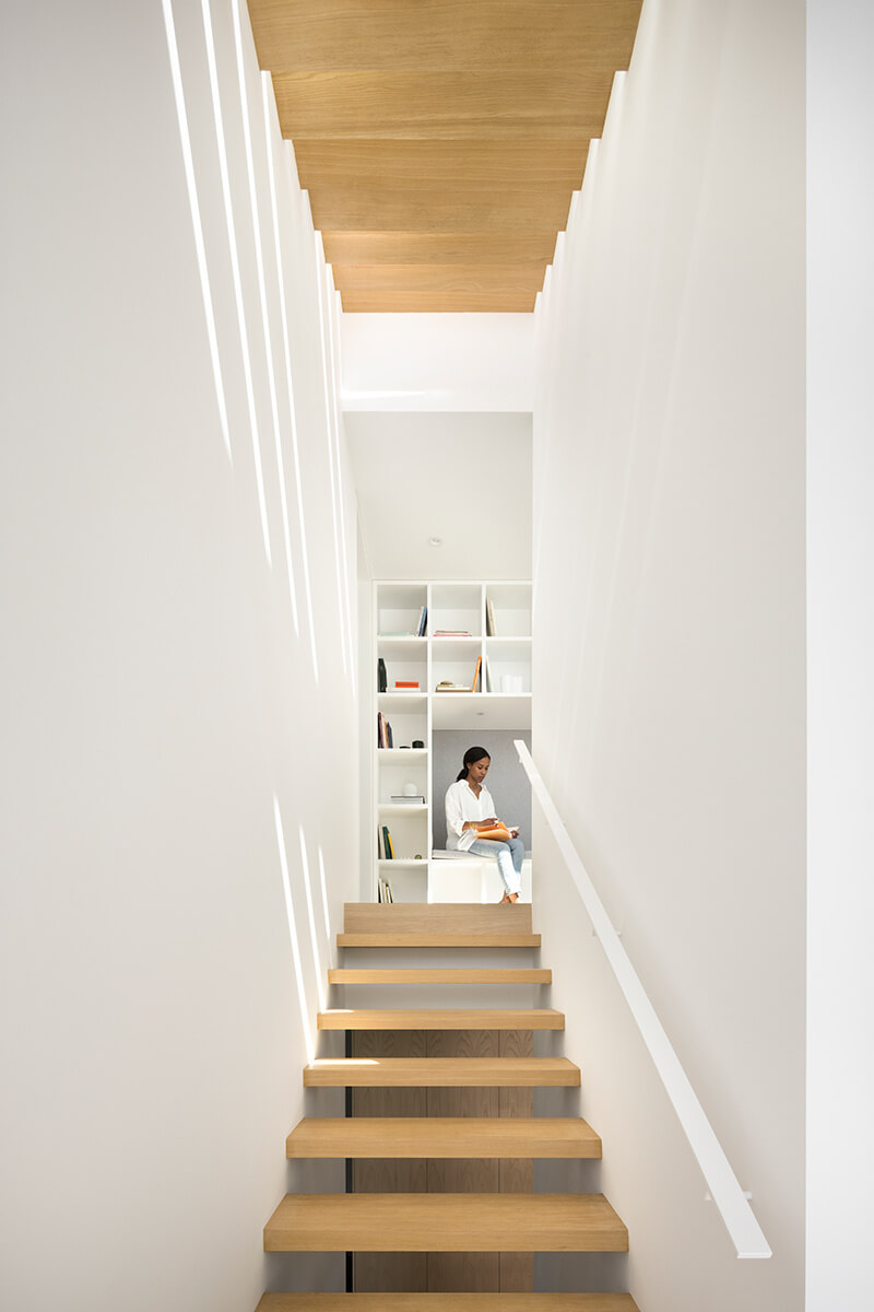 The house has large sliding glass doors that lead out to a deck at the rear. The deck further enlarges the space and connects indoors and outdoors. The interior of the house is a bright and open space with a staircase continually bathed in ever-changing quality of light from the skylight or roof deck access above.