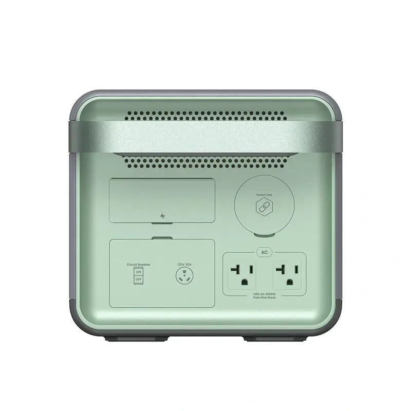Furthermore, the B4000 also features a UPS function for seamless usage. Gallium Nitride transistors minimize energy loss and boost lifespan. The front panel has 2x USB-A ports, 1x USB-C PD, 1x USB-C, 2x DC ports, and a digital display. You can find two wireless charging pads on top. Lastly, the rear holds 2x AC outlets, 1x TT-30R, 1x solar/car port, 1x AC input port, and 1 Smart Link port to hook up optional modular add-ons.