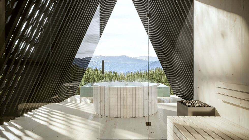 The cabins reference the idea of a “treehouse without a tree.” The design features exaggerated gable roofs typical of traditional treehouses. The shape of the roof also mimics the silhouette of the surrounding pines. This results in vertical pitched volumes with interior spaces elevated above the ground on a shrunken footprint similar to the trunk of a tree. The overall architecture design thus takes inspiration from its surrounding forest topography.