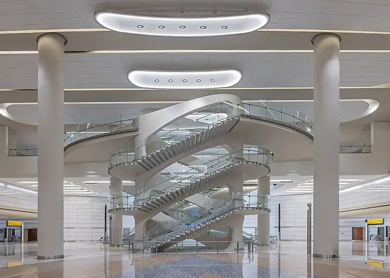 KPF wanted to impart a feeling of being in an open area as the Departure Hall spans a huge area sans any columns. Then there’s the curated lighting which enhances the visual splendor of the interior volumes. Passengers arriving can pass through a sculptural stair named the Feature Staircase.