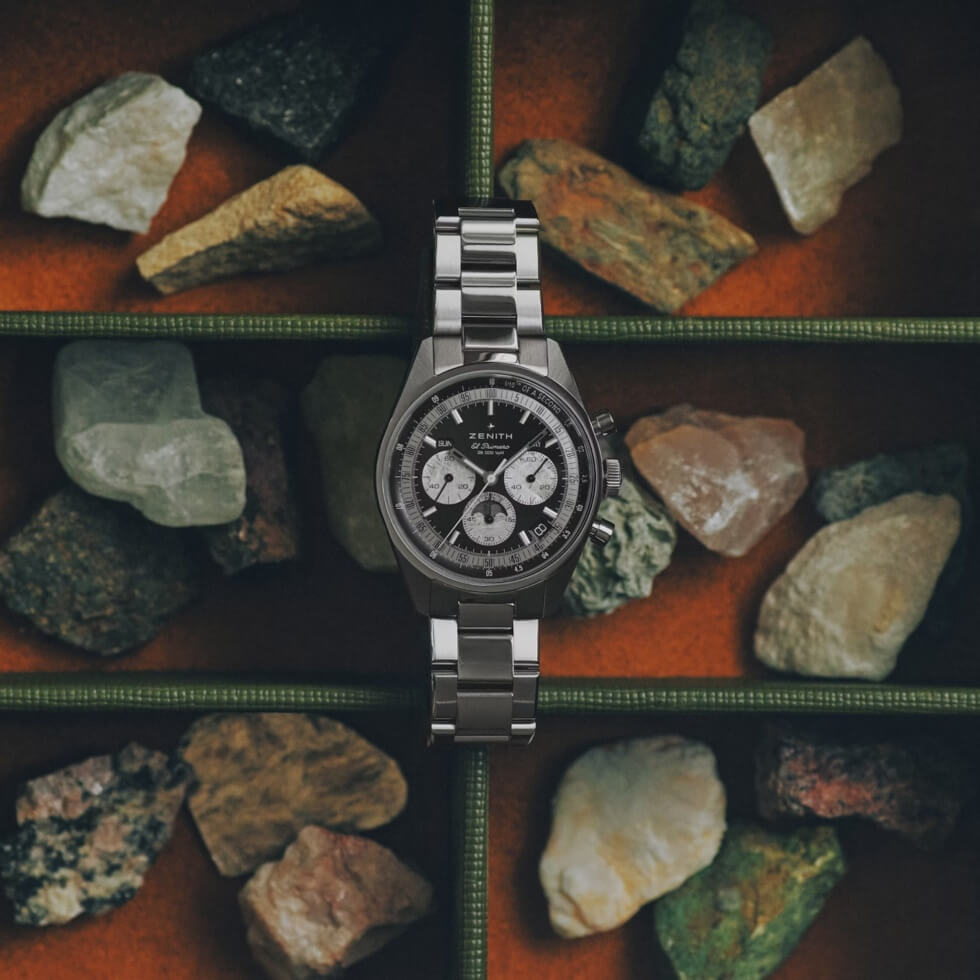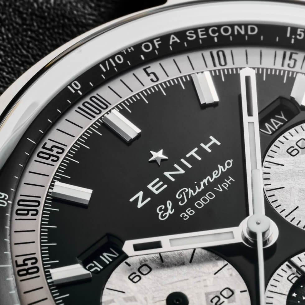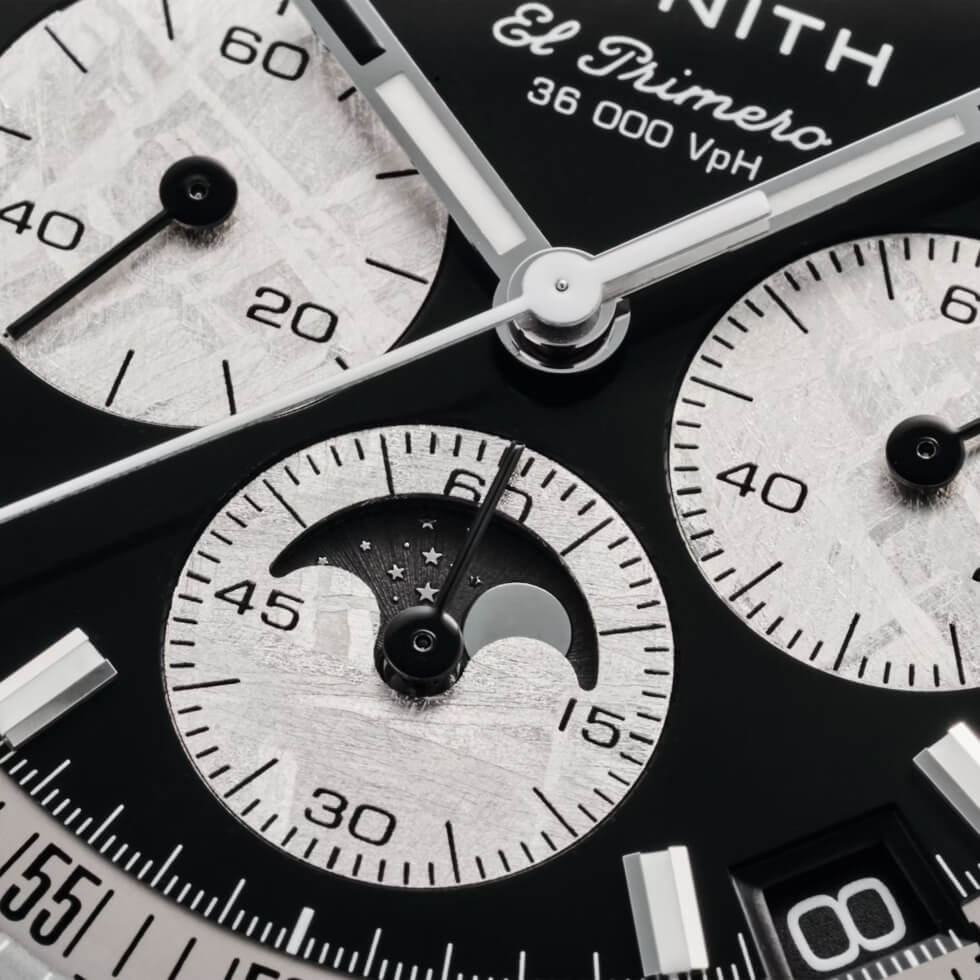 Contrasting the black backdrop of the dial are three subsidiary counters with a moon phase indicator at 6 o’clock. Likewise, Zenith tells us these are fashioned from a 4.5 billion-year-old meteorite. A close-up view of the surfaces shows the telltale Widmanstätten patterns.