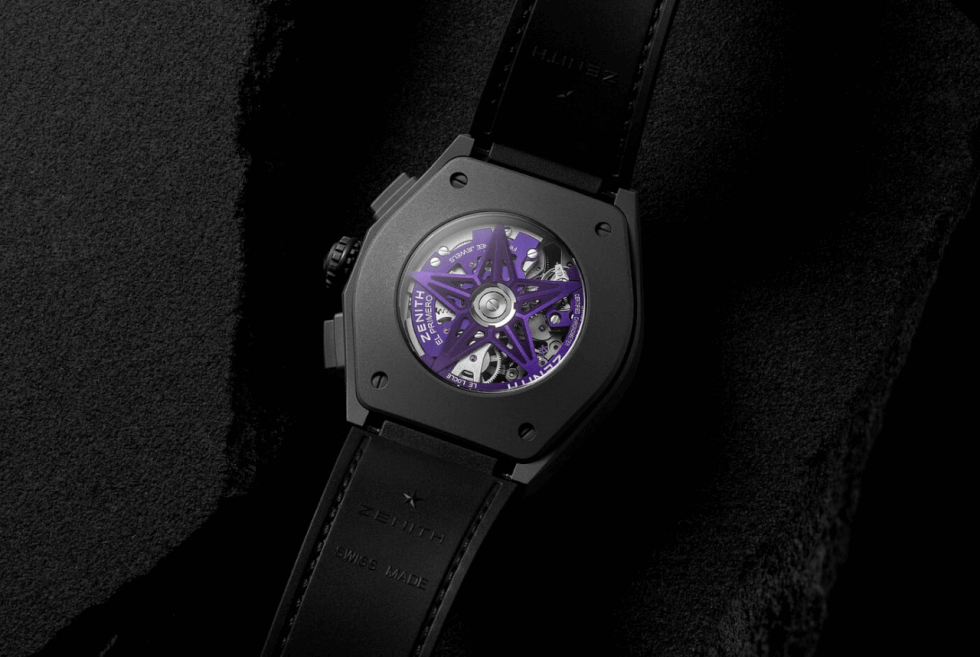 The openwork dial keeps up with the theme as bridge assembly flaunts violet anodized coating. Additionally, this extends to the star-shaped rotor which is in full display via its exhibition case back. As with most premium chronographs, the Defy El Primero 21 Ultraviolet features sapphire on the top and bottom. Viewing it from the side shows the pushers and crown adorned with the Zenith emblem.
