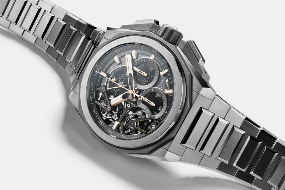 ZENITH’s titanium DEFY Extreme Double Tourbillon flaunts a mix of polished and horizontally brushed finishes all over the housing and its bracelet. The darker shade of its dodecagonal bezel, crown and crown guards provide just enough contrast from the brighter tone of the remaining parts.