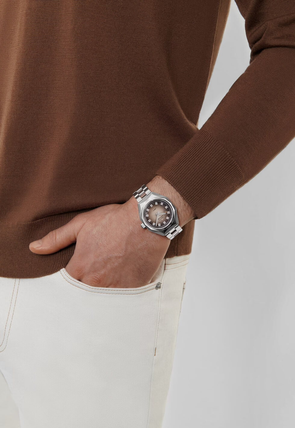 It may resemble the original in every way possible, but it packs some contemporary updates as well. The Defy Revival A3642 sports a taupe dial in a fumé finish for that classy gradient motif. The minute track is in white, while the applied hour markers sport horizontal ridges. The sword hands now have Super-LumiNova instead of the tritium lume of the 1960s models.