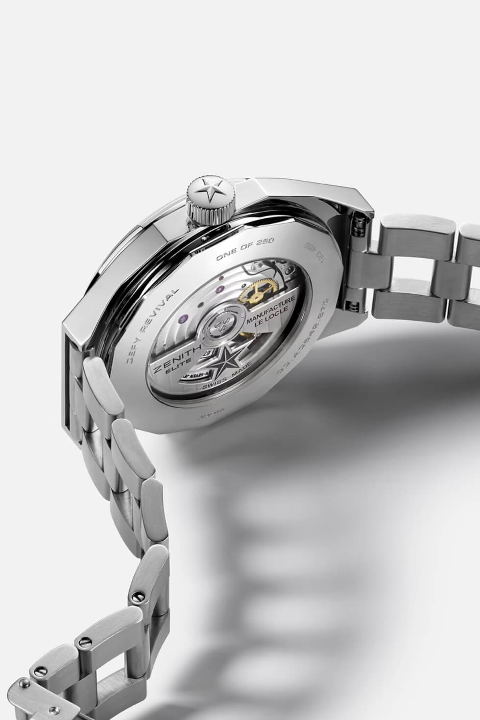 Its exhibition caseback shows the rotor with the signature star emblem. This keeps the Elite 670 automatic movement fully wound as long as you have the Defy Revival A3642 on your wrist. Meanwhile, the power reserve is good for 50 hours. Zenith then pairs it with a stainless-steel ladder bracelet.