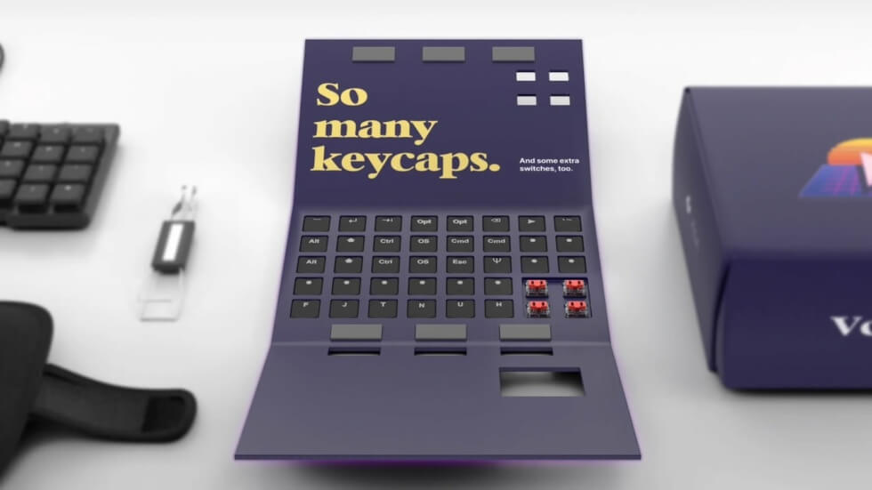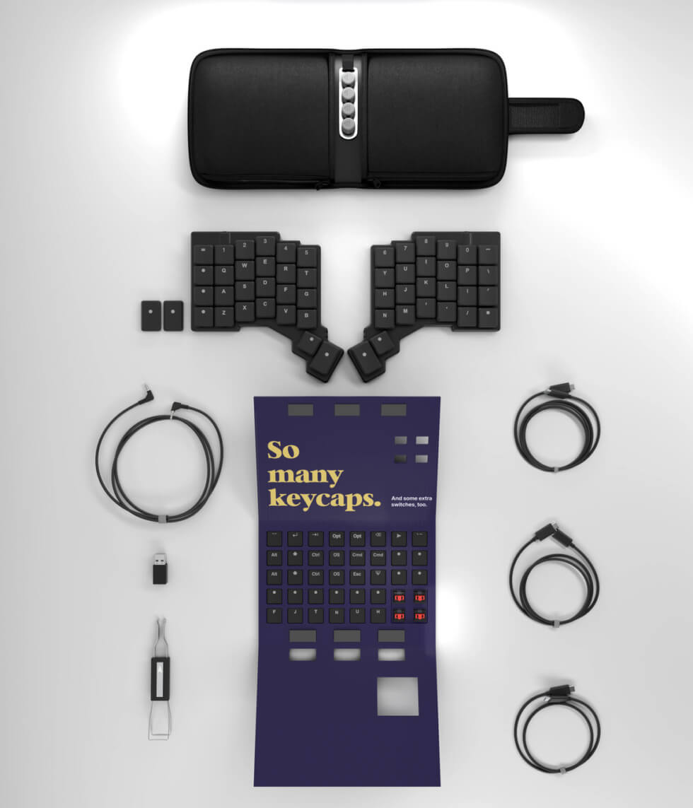 38 extra keycaps are also in the box, should you choose to configure the layout of your Voyager. As for add-ons, these snap into place with the help of magnets and orientation pins. ZSA offers a slew of accessories so users can craft a bespoke typing experience and even snap on a trackball in between the two halves.
